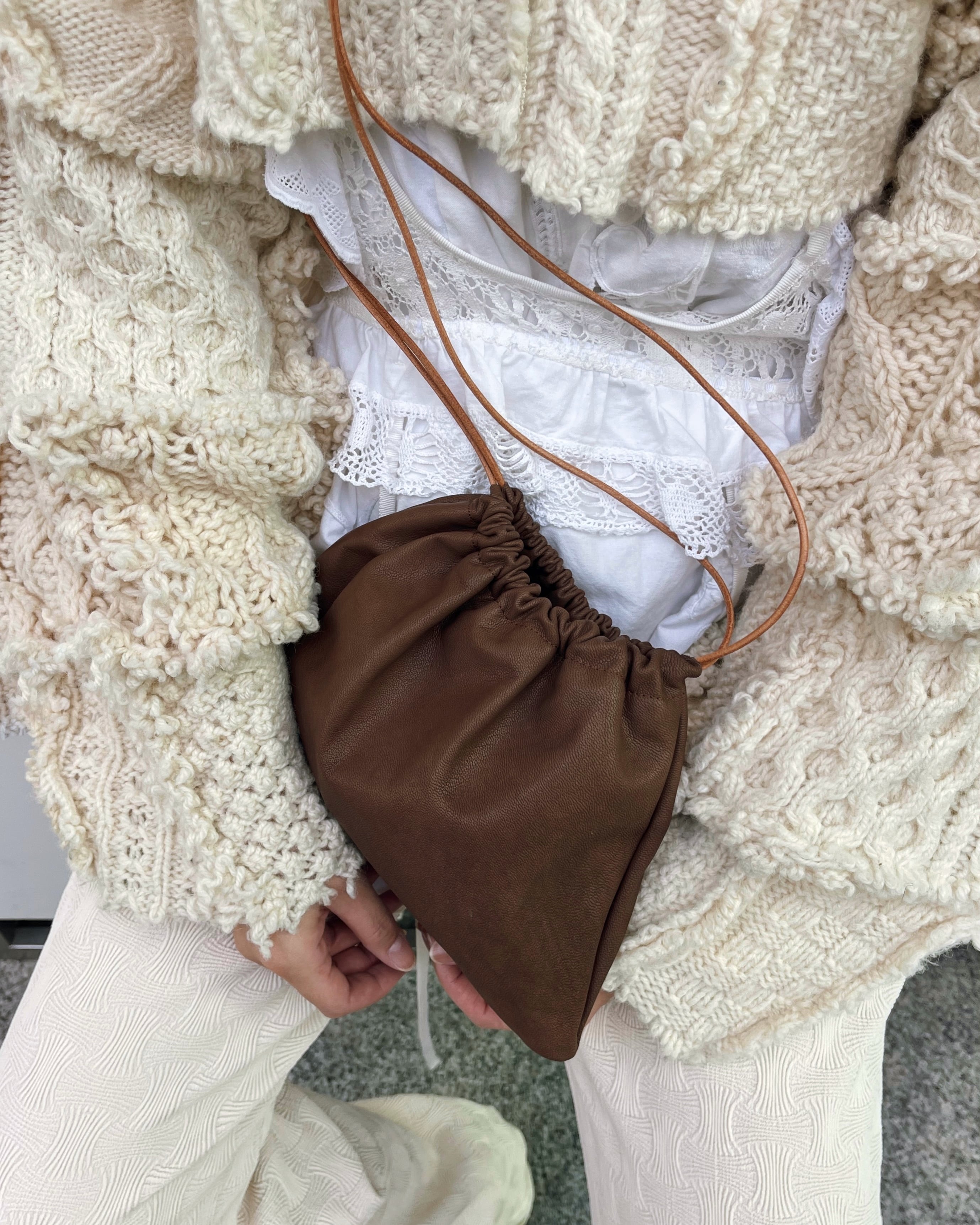 シンプルなヤギレザーの巾着バック。