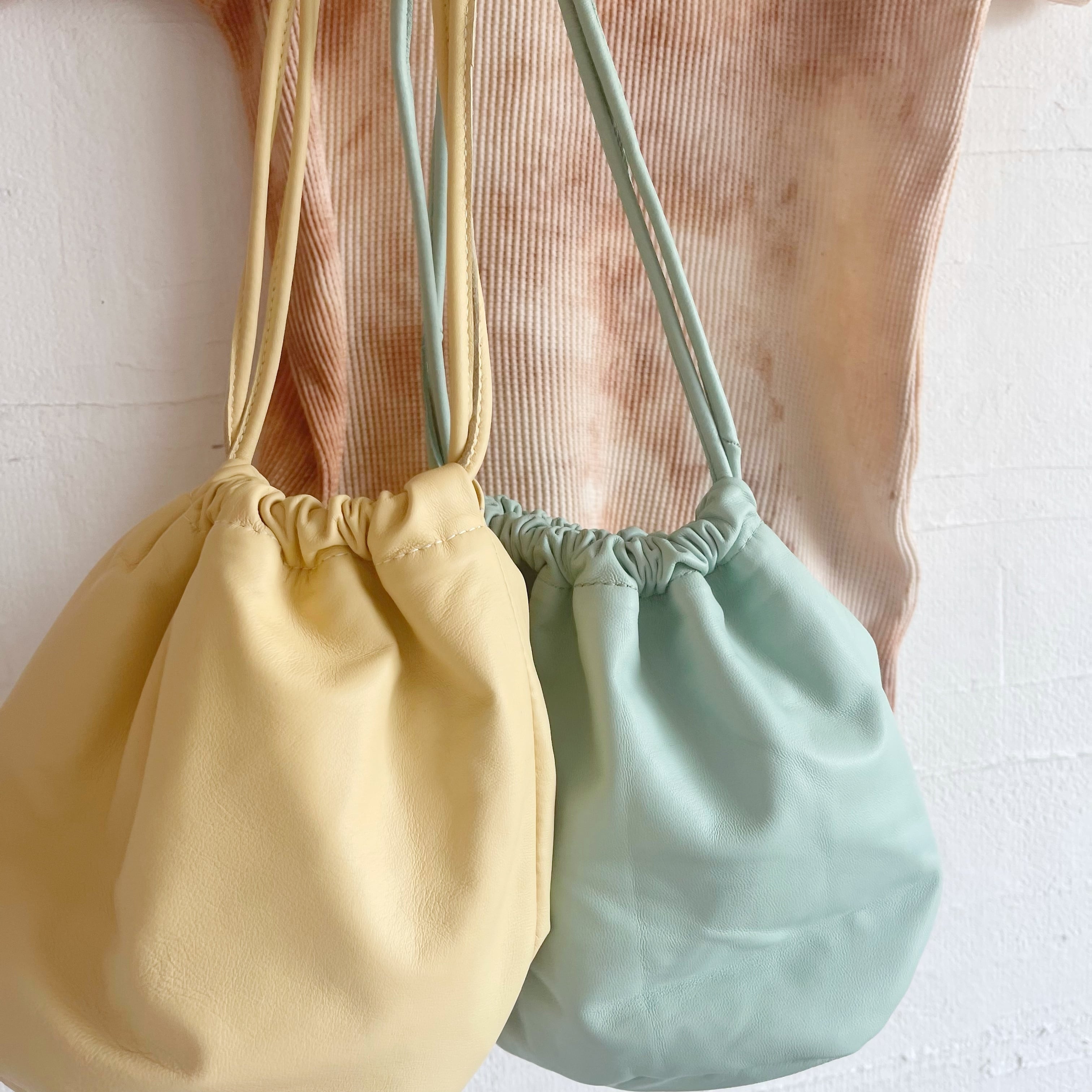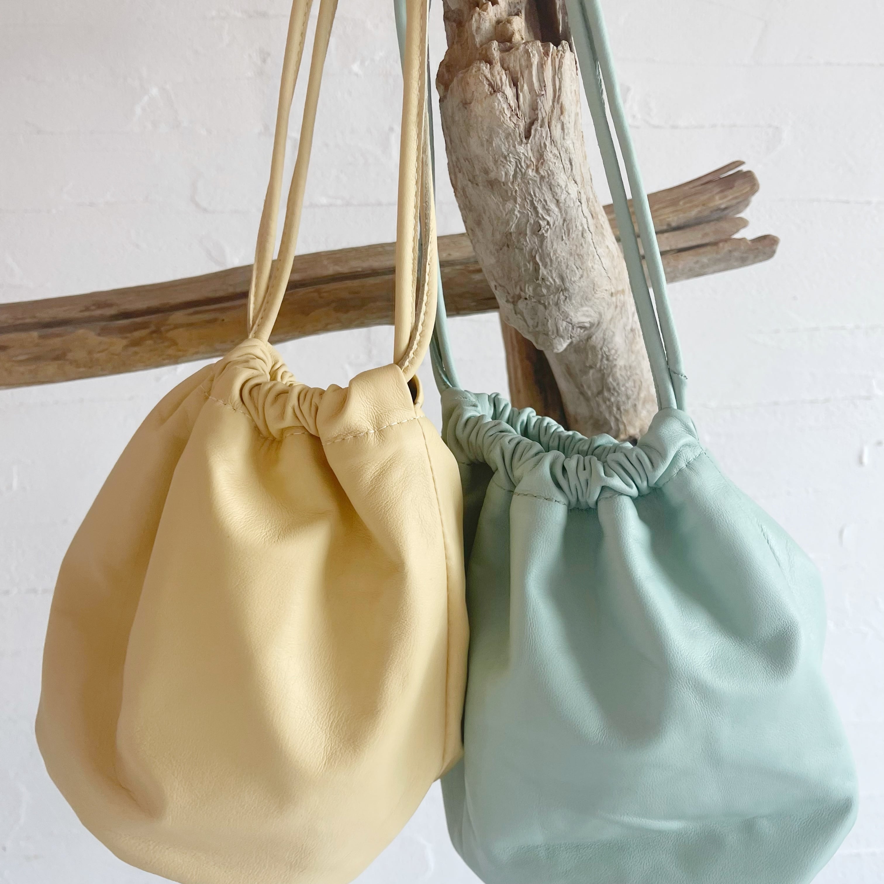 柔らかなラムレザーの巾着バッグ。