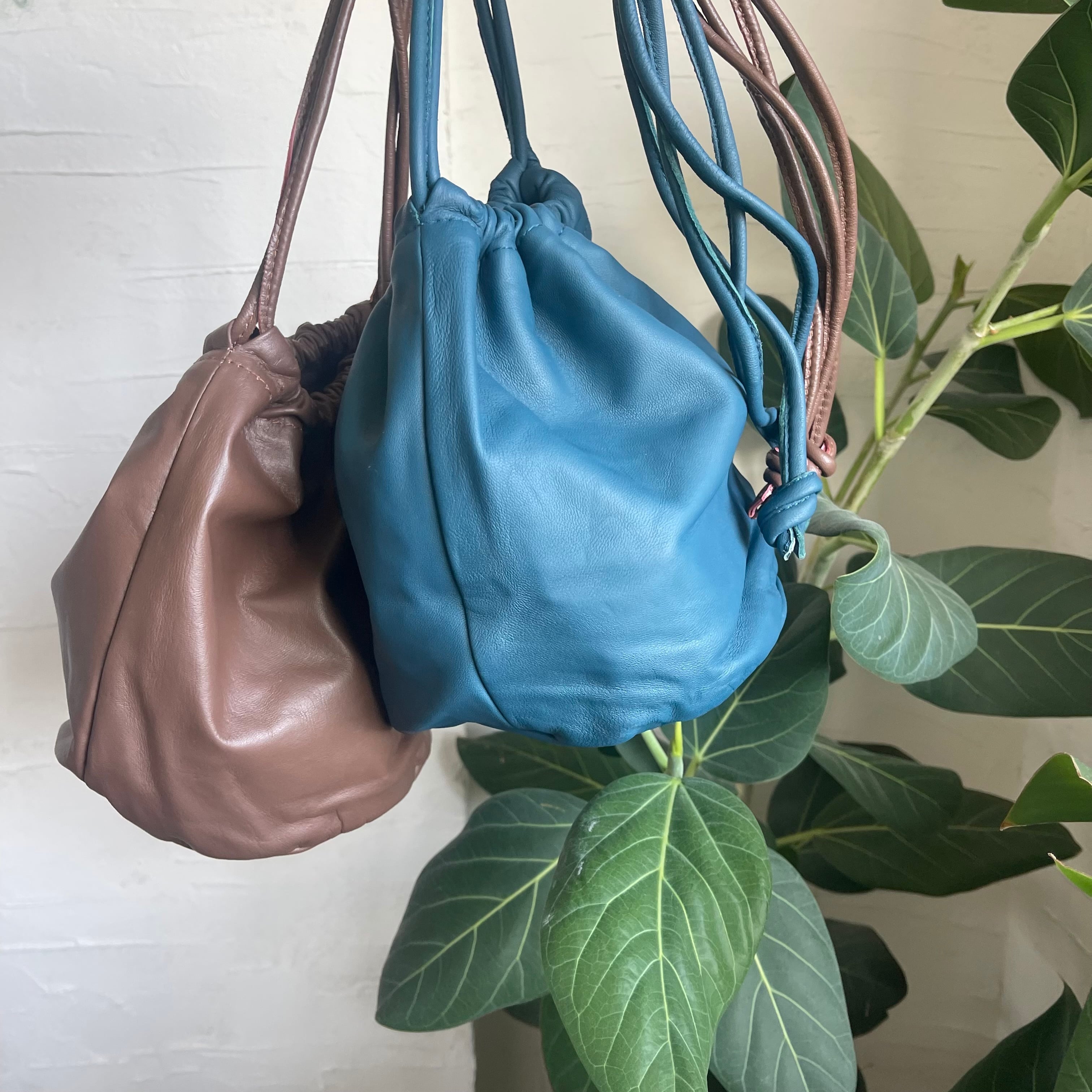 柔らかなラムレザーの巾着バッグ。
