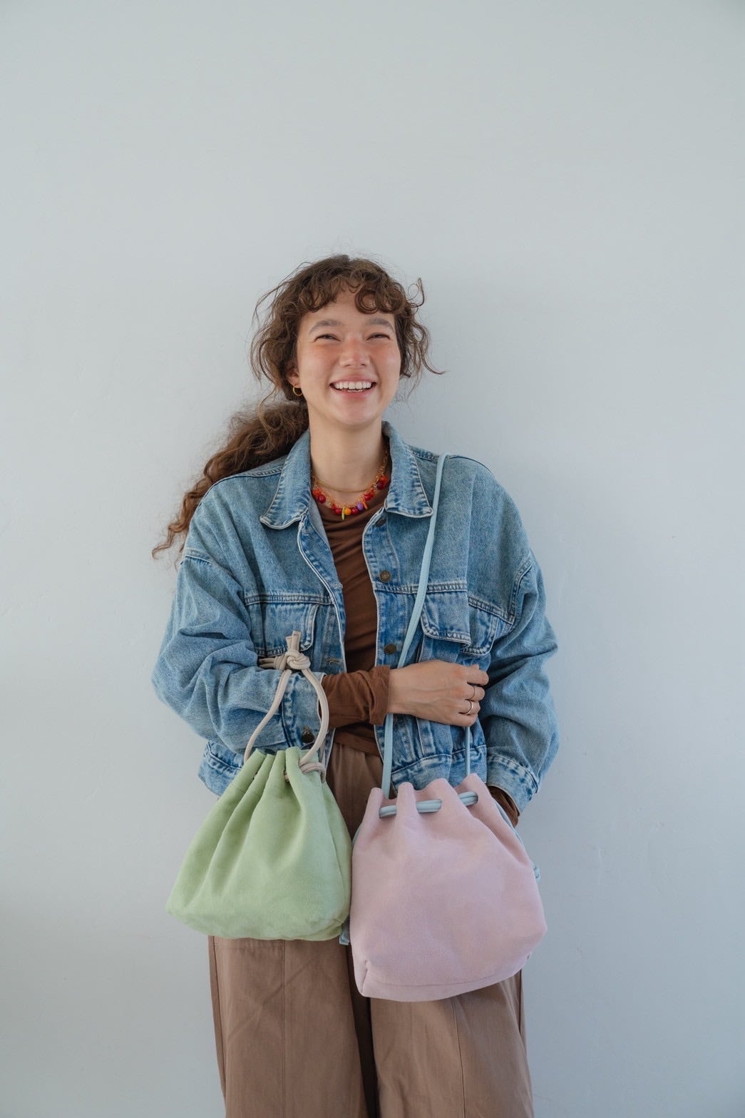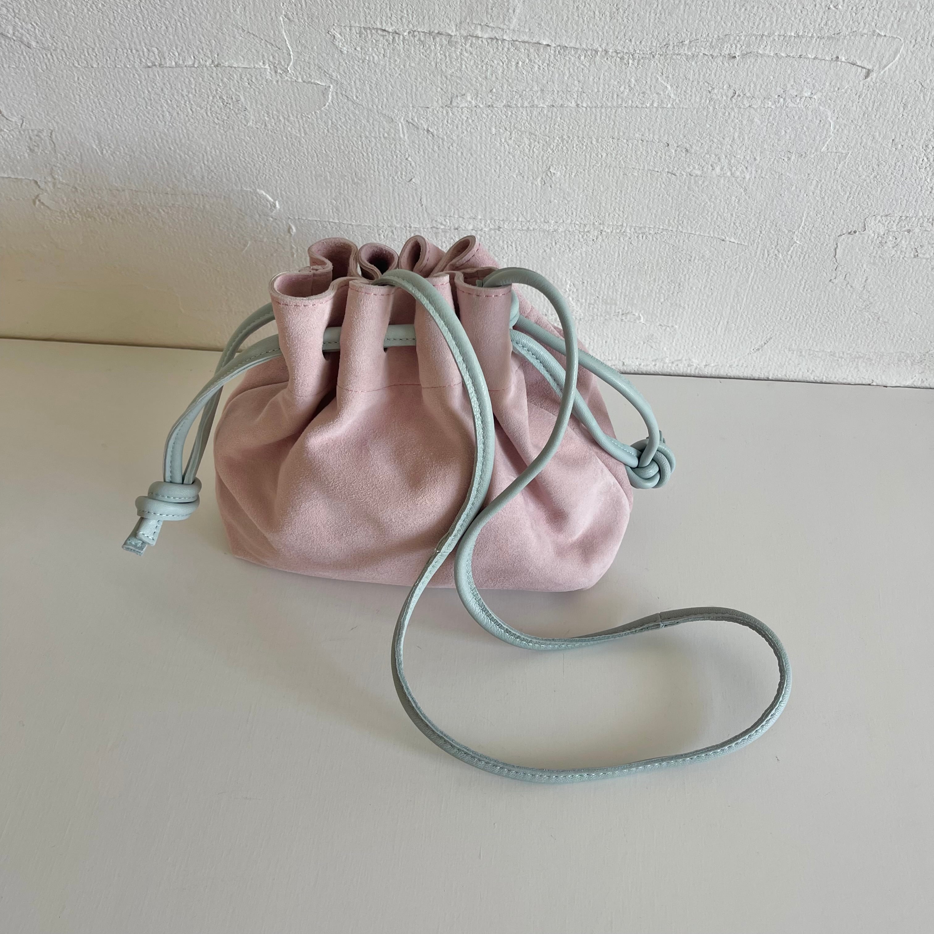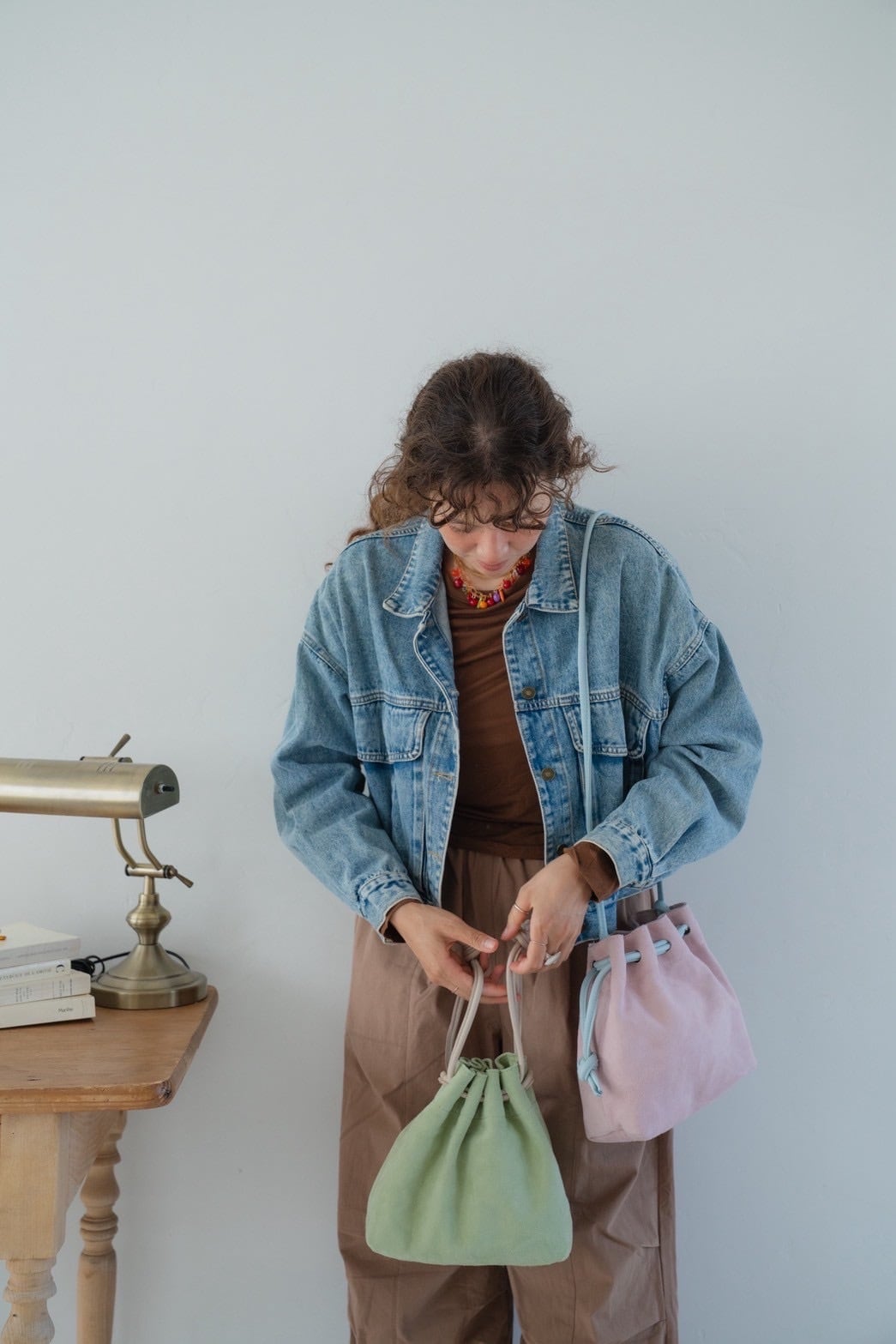 アクセントになったチューリップのような巾着バッグ。