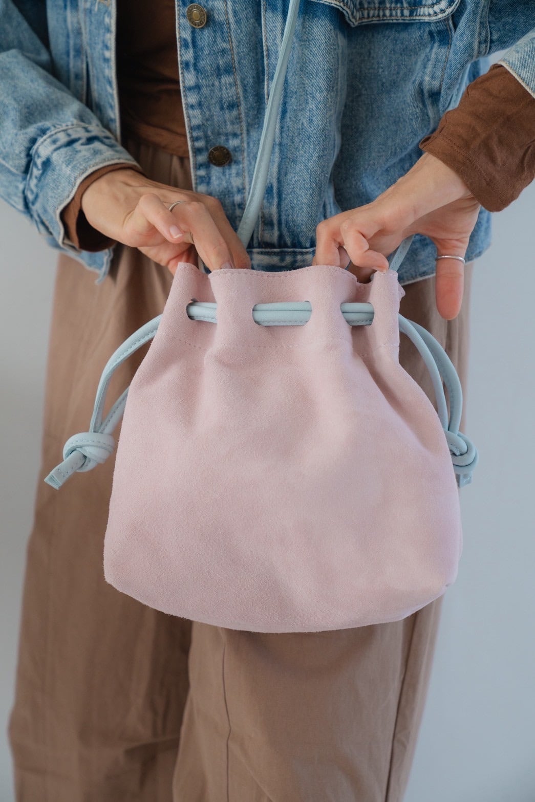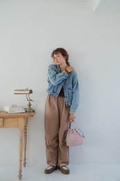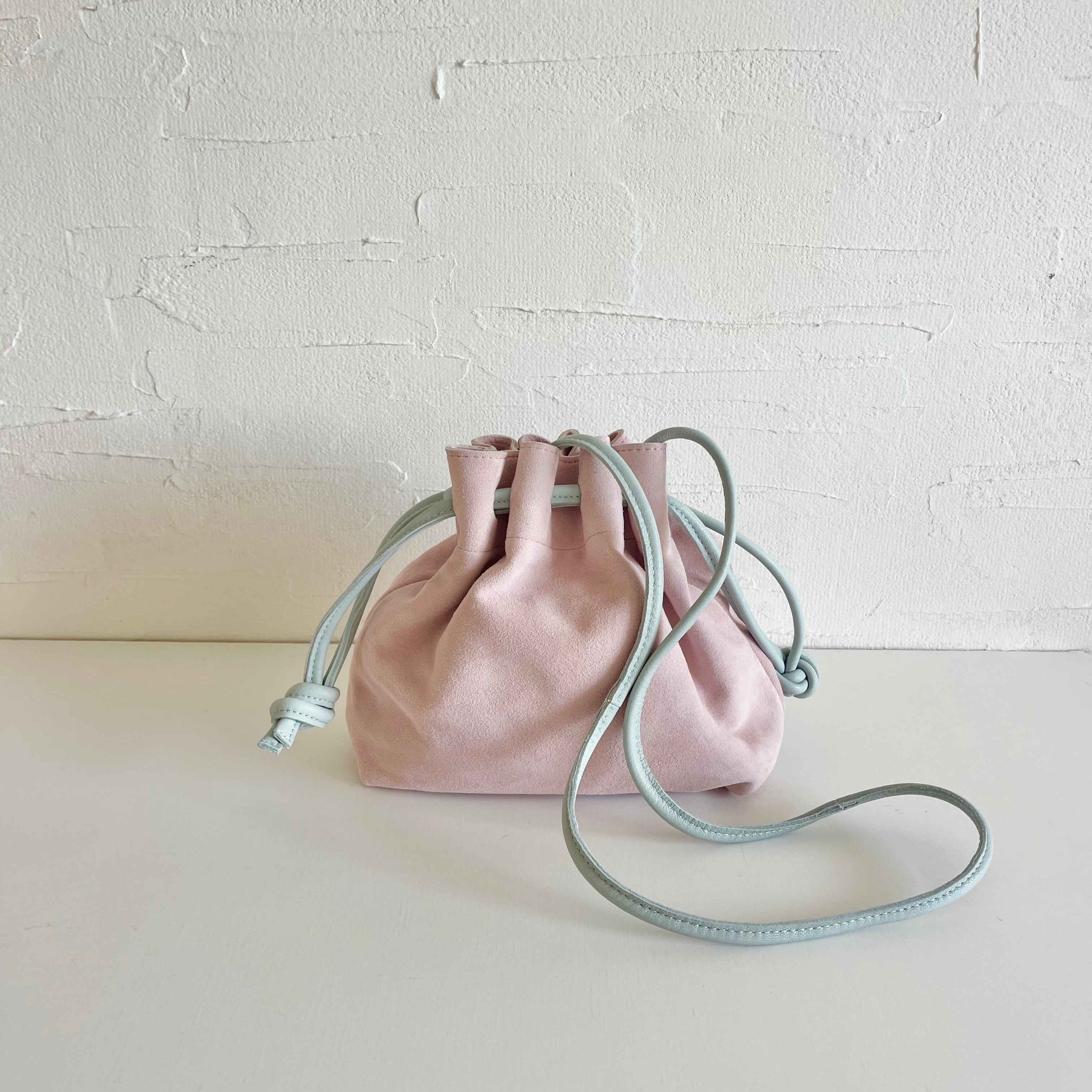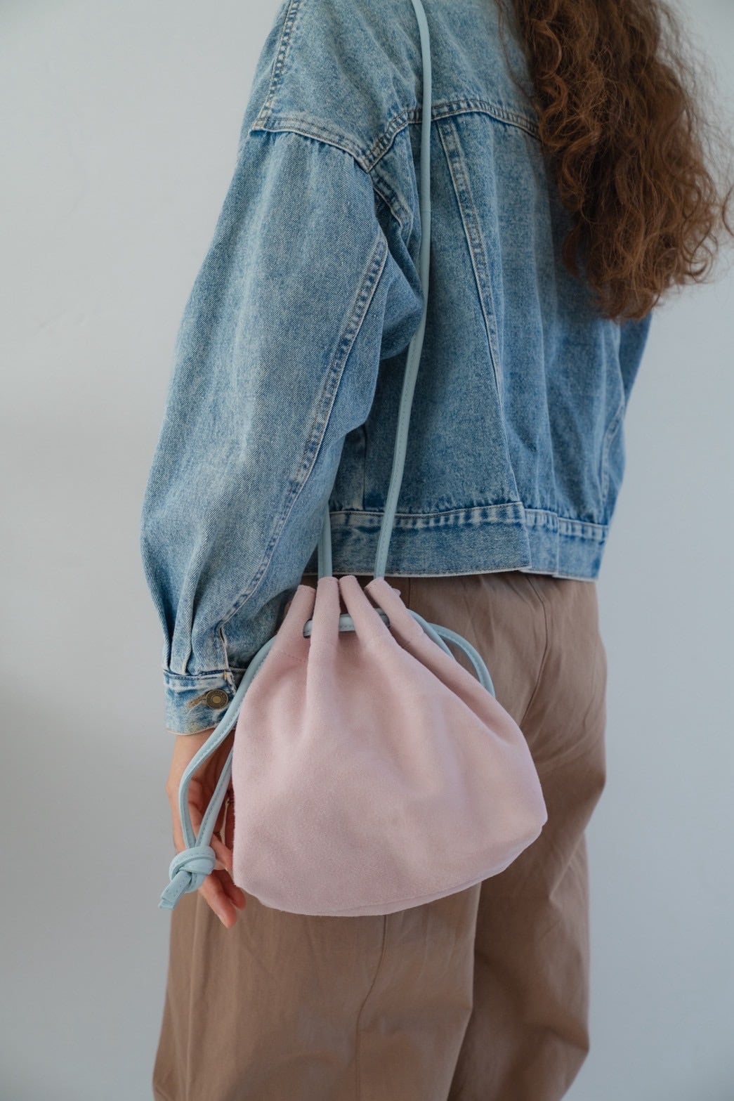 アクセントになったチューリップのような巾着バッグ。